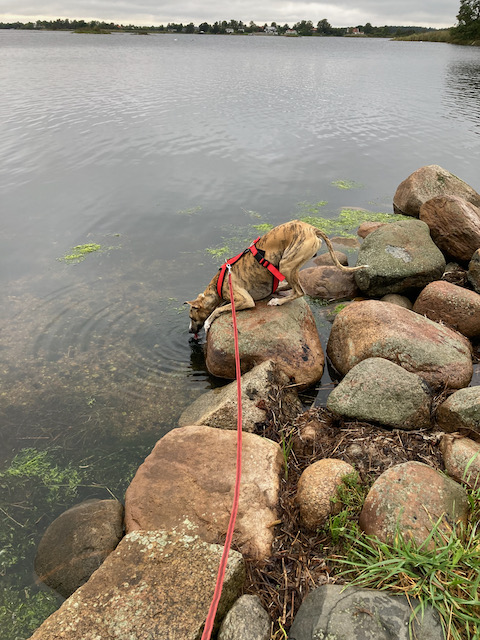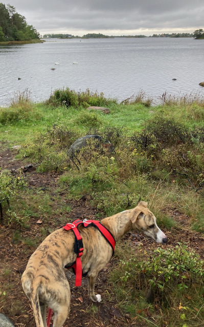 Vi går på många platser i vårt närområde och njuter väldigt mycket av naturen på våra promenader, så jag blev sugen på att skriva om en bra runda som vi tog igår. Vi började vår tur vid Stensö, T-bryggan. Regnet hängde i luften och det var inte direkt kallt, snarare lite ljummet. Först passerar vi båtplatserna vid T-bryggan och det tycker Elton är spännande. Det är alltid lite prassel och fladdrande presenningar och sånt som han blir lite rädd för och måste undersöka.