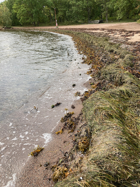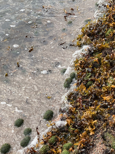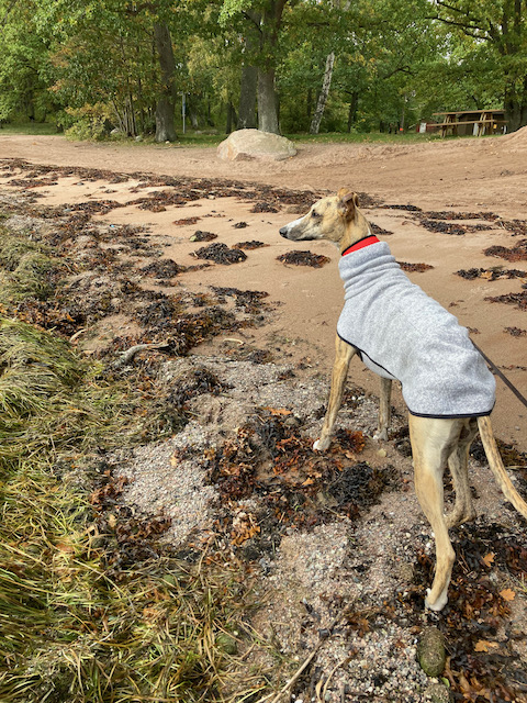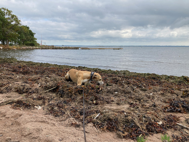Idag gick vi en kortrunda på lunchen och upplevde korsningen av skog och hav på stranden. Höstvindarna har spolat upp massor med sjögräs, tång och alger på stranden och det bildar ett eget landskap där det värt att lägga mycket snifftid. Där fanns vassrötter, ålgräsbollar, blöta pinnar och mjuka tångbäddar. Elton valde så klart att lägga sig i tången och tugga en stund.