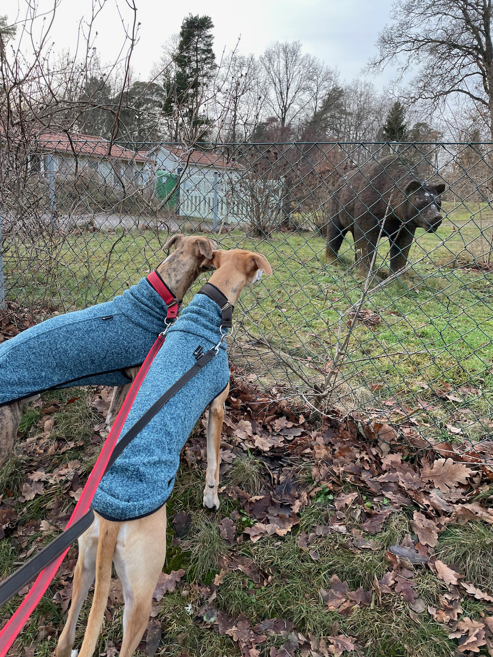 Den här rundan hittade jag, lite för mig nya stigar, att gå på med Otis och Elton. De tyckte att det var riktigt spännande att gå den här rundan. Det är många hundar som rastas här, misstänker jag, men vi såg faktiskt bara två på lite avstånd idag. Vi såg i och för sig också en björn, av modell: ”större trädgårdskulptur” och Elton i spökåldern visste inte hur han skulle reagera, medan Otis tog tag i det och skällde ut den rejält. I spökåldern (7-8 månader och framåt) är det vanligt med oväntade reaktioner på saker och Elton hamnade mest i frysläge, som han kom ur själv, vilket var bra gjort av honom. Blev ju lite miljöträning tack vare det här mötet. Det var väldigt tydligt hur svårt de hade att tolka vad det var för någon figur eftersom staket var emellan och de inte kunde komma fram och titta och nosa på nära håll.