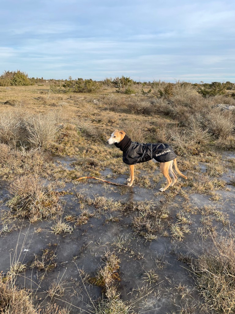Vintertid är en hundrunda i vår omgivning oftast kall och blåsig. Det kan vara snö, blask eller torrt. Nu har vi haft det torrt och bra och minus på nätterna. Hundarna kör då oftast med ett lager täcken; ylleflis eller fleecefodrad jacka, typ Back-on-track. De gillar väl inte täcken så där jättemycket, men de gillar inte att frysa heller så det är bäst att köra täcke när det är möss-läge för oss.